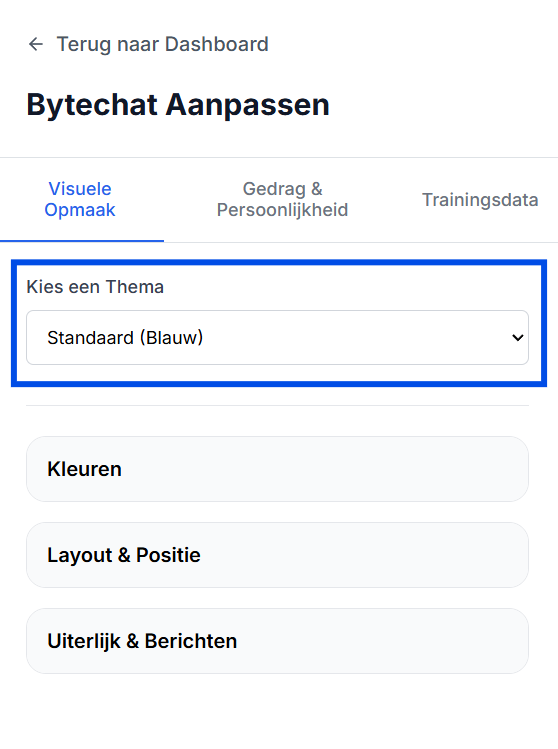In deze sectie leggen we uit hoe je de visuele opmaak van Bytechat aanpast: kleuren, typografie, knop- en berichtstijlen en lay-outopties. Maak Bytechat consistent met de stijl van je bedrijf.