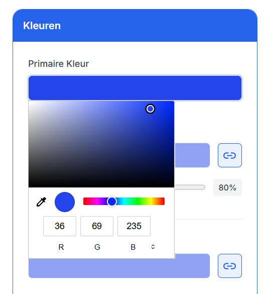Om de algemene kleur van Bytechat aan te passen gebruik je de "Primaire Kleur" kleurenkiezer. Wanneer je deze kleur wijzigt, zullen alle gekoppelde kleuren meeveranderen.