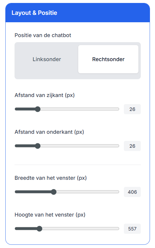 - Positie van de chatbot: Kies of de chatbot links of rechts in de hoek staat.