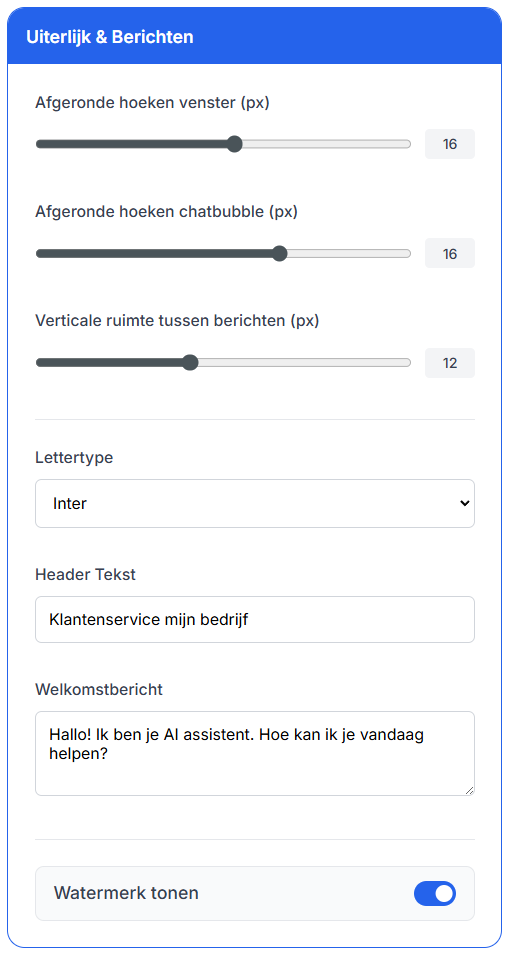 Je kunt het uiterlijk van de chatbot en de stijl van de berichten aanpassen met de volgende opties: